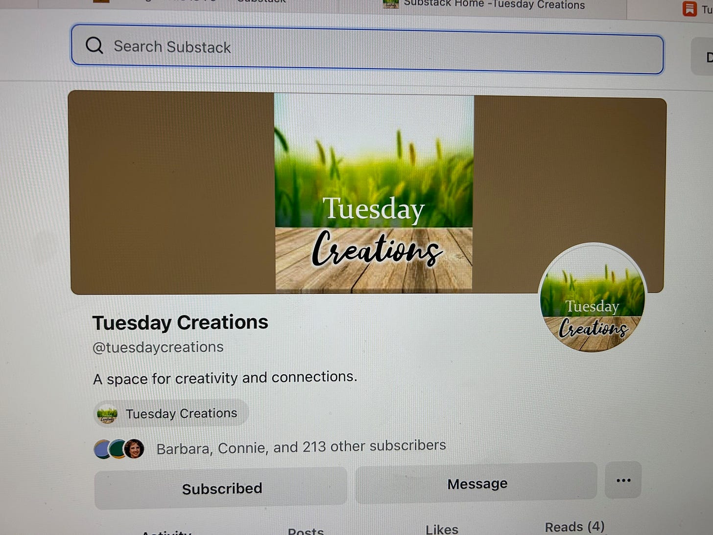 But right now, I’d like to invite you to join another Substack page I belong to called Tuesday Creations, administered by my online friend, Cathey Cone. It’s the perfect place for people looking for a creative outlet.